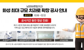 안녕하세요.남양바른탑치과에서 인사드립니다 :) 남양바른탑치과는 환자분들께 보다 쾌적하고 수준 높은의료서비스를 제공하기 위해 아래 기간 동안 확장 공사를 진행합니다.확장 공사 기간2025년 10월 18일 ~ 2025년 12월 12일화성 서부 지역 최대 규모 치과로 도…