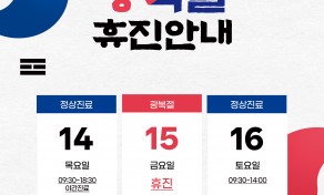 ✨ 8월 진료 안내 ✨안녕하세요, 남양바른탑치과입니다.푸르른 여름의 한가운데,항상 환자분들의 건강한 일상과 밝은 미소를 응원합니다.✅ 8월 15일 (금) 광복절 ▶ 휴진 토요일은 평소처럼 정상 진료하오니진료 및 예약에 참고 부탁드립니다.카카오톡 상담 및 네이버 예약은 …