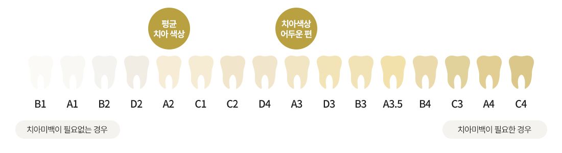 20~30대 연령층의 평균적인 치아색은 A2정도이며 A3부터는 어두운 치아색에 속합니다.