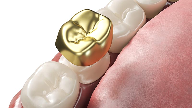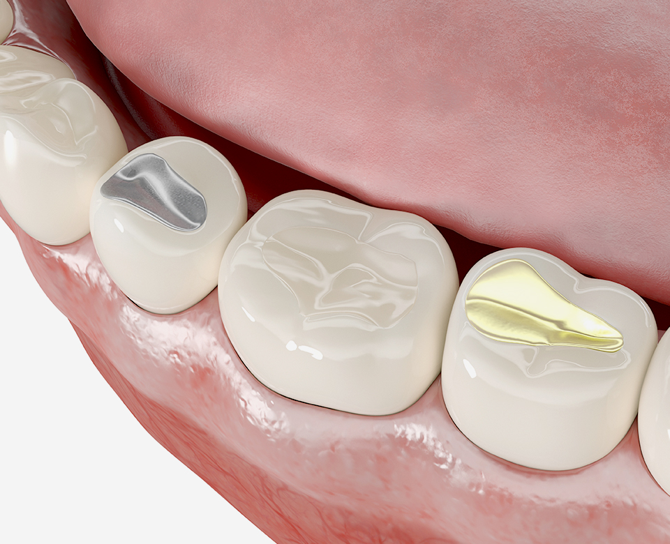 우식부위가 넓거나 씹는 힘이 강한 어금니 부위에 적합하며 인체에 무해하며 부식이 없습니다. 내구성이 뛰어나 안정적으로 오랜기간 사용이 가능하지만 눈에 잘 보이는 전면부에는 심미적인 이유로 사용하기 어렵습니다.