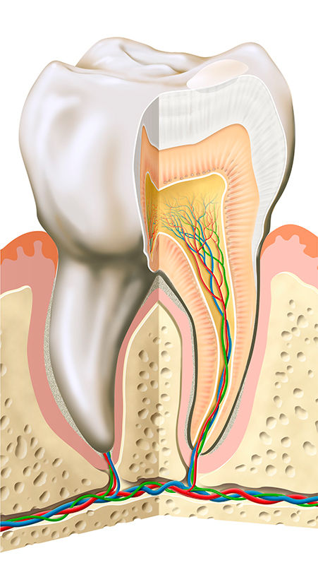 치아는 딱딱한 경조직이지만 그 안은 신경 및 혈관 같은 연조직이 자리잡고 있습니다.