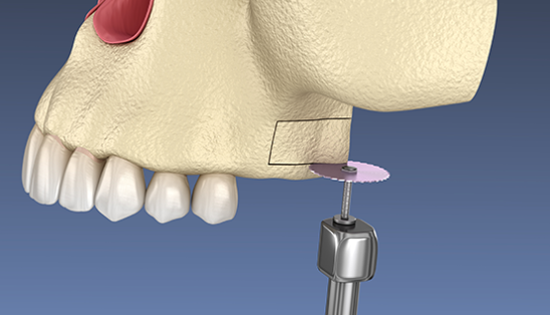 잇몸을 절개하고 난 후 뼈를 넣고 상악동을 들어 올릴만한 작은 통로를 만들어 뼈이식할 공간과 임플란트 식립할 공간을 확보합니다.