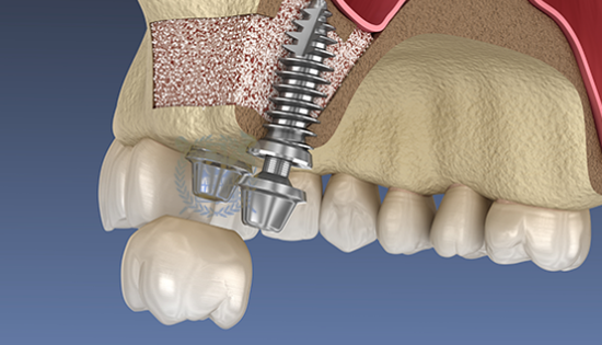 골소실 범위가 광범위할 경우 수직적, 수평적 골재생을 위하여 콜라겐 멤브레인 혹은 티타늄 메쉬 등을 사용하여 뼈이식재의 안정적인 유지를 도모하는 술식입니다.