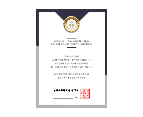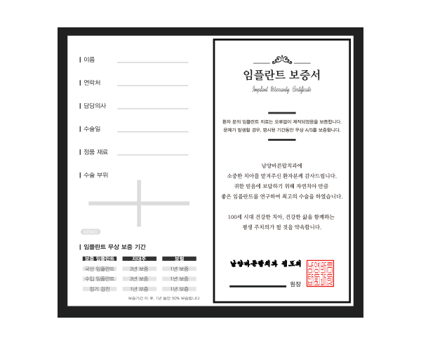임플란트와 치아교정, 일반 보철치료를 받으신 분들에게 진료보증제도를 시행하고 있습니다. 임플란트는 최대 3년, 치아교정은 2년, 일반보철은 1년 간의 단계적인 진료 보증으로 환자분들의 경제적 부담을 덜어드립니다.